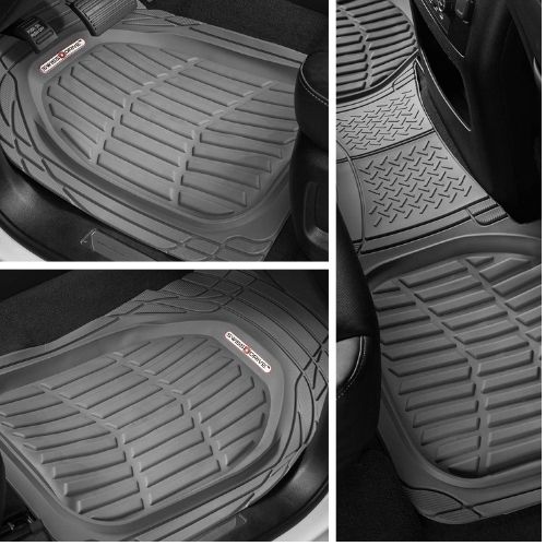 Juego de alfombras de goma de primera calidad, tipo universal, se pueden cortar a medida para un ajuste perfecto El juego de alfombras incluye: 2 delanteras, lado del conductor y del pasajero, 2 traseras conectadas al puente Diseño de canales especiales para una fácil extracción y limpieza de líquidos, nieve, barro y suciedad.