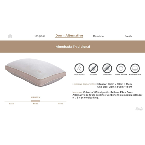 Las almohadas de Down Alternative ofrecen un buen equilibrio entre suavidad y soporte, y están diseñados para proporcionar una sensación de lujo y comodidad al dormir. También son fáciles de mantener, ya que son lavables a máquina y pueden conservar su forma y calidez con el tiempo – Almohada Sealy Down Alternative Tradicional de confort medio, confeccionada en algodón hipoalergénico, antiácaros y antibacterial. Relleno de fibra down alternative con tratamiento Silver Clear – Cuidados: usar detergente liquido suave. No usar cloro, ni suavizantes. Secar colgado o con secadora a temperatura media. No lavar en seco. No planchar. Dar un ligero masaje para volver a esponjar las fibras – Datos técnicos: Cubierta 100% algodón. Relleno: Fibra Down Alternative de 100% poliéster. Contiene 1.3k medida king.