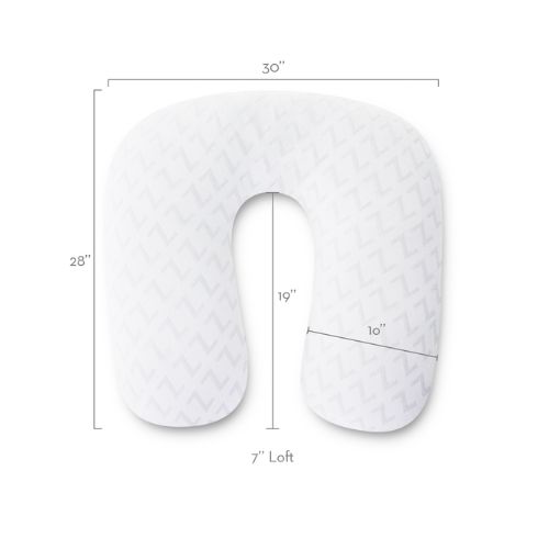 Almohada de embarazo. Proporciona soporte para la espalda y el abdomen para aliviar las molestias de la maternidad. El diseño versátil proporciona soporte personalizado. El lujoso relleno alternativo al plumón se siente como plumón sin olores, alérgenos ni púas afiladas. La funda extraíble de Tencel™ Lyocell con propiedades superiores de gestión de la humedad. ayuda a lograr temperaturas óptimas para dormir. Mide 28 x 30 x 7 pulgadas.