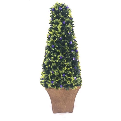 Arbolito artificial con base y un diseño que combina las hojas con dos tonalidades diferentes de verde y detalles morados.