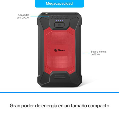 Arrancador: Está diseñado para autos compactos, subcompactos, SUV y motocicletas. Su pico de corriente es de 300 A – Power Bank: Recarga la pila de celulares, tablets, bocinas y más gracias a que incorpora una salida USB. La capacidad de la batería de respaldo es de 7 000 mAh – Linterna LED: Incorpora un LED ultrabrillante que funciona como linterna en caso de que la necesites en alguna reparación nocturna o un apagón inesperado – Indicador de carga: Tiene 4 luces LED para indicar el nivel de carga de la batería interna.