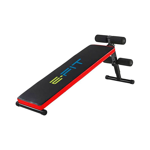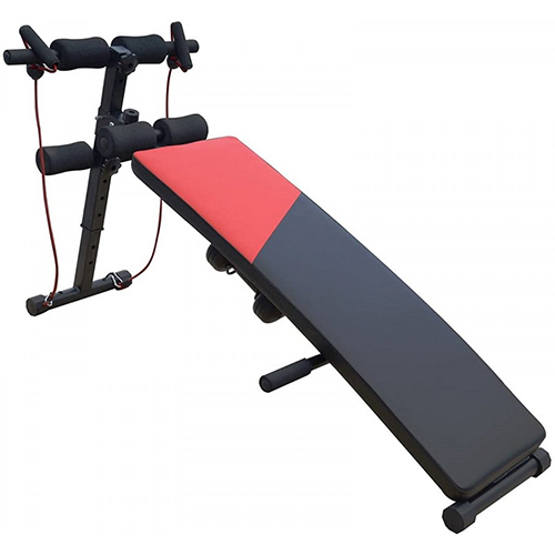 El banco abdominal cuenta con un marco de acero y un asiento de vinil cosido en color negro y rojo. Ideal para ejercicios con mancuernas y levantamiento de pesas. Adicional a eso, incluye dos mancuernas de 1.5 kilogramos y dos ligas que forman parte de la banca para añadir variedad de ejercicios y calentamiento en tus entrenamientos. Cuenta con un bloque de pierna de 6 rodillos.