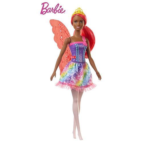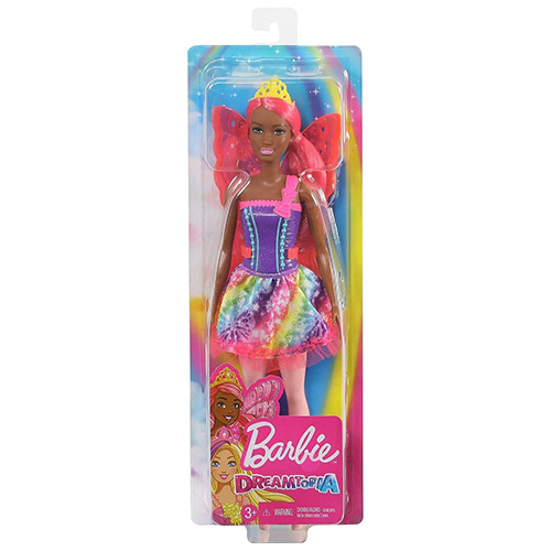 Las muñecas de hadas de Barbie Dreamtopia™ inspiran la imaginación de los jóvenes a tomar vuelo con alas deslumbrantes y modas coloridas aptas para una aventura de cuento de hadas! Esta hada Barbie® luce un corpiño y una falda brillantes con un estampado de arcoíris y detalles de mariposas. Las alas translúcidas con un toque de color despiertan la narración de cuentos y los sueños de cuentos de hadas, y se puede usar una tiara a juego en su cola de caballo rosa para completar el look. Es fácil representar sueños reales e imaginarios con Barbie® porque cuando ingresas a Dreamtopia™, ¡te despiertas en un mundo donde los sueños se hacen realidad! Los amantes de los cuentos de hadas pueden coleccionar todas las muñecas y juguetes Barbie Dreamtopia™ para construir el mundo y dejar volar sus sueños. Cada uno se vende por separado, sujeto a disponibilidad. Las muñecas no pueden estar solas. colores y decoraciones