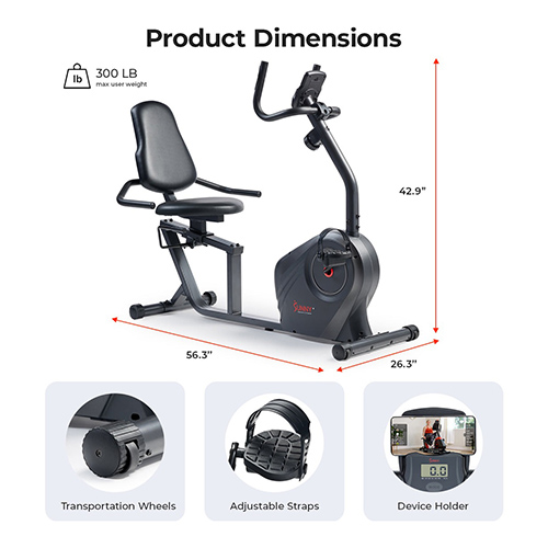 La salud de las articulaciones importa: nuestra bicicleta reclinada ofrece un entrenamiento de bajo impacto que reduce el estrés en las articulaciones y proporciona un mejor apoyo de espalda con su posición reclinada. Es ideal para ejercicios multiusos, rehabilitación, salud cardiovascular y tonificación muscular – Experiencia ininterrumpida: el paseo ultra silencioso y suave con 8 niveles de tensión magnética y un mecanismo de transmisión por correa es ideal para el hogar. Cambia la intensidad sin esfuerzo con un simple giro de marcado. Sumérgete en tranquilidad con nuestra bicicleta reclinada – Diseñado para una mayor comodidad: disfruta de la comodidad con un asiento de cojín extra ancho de 17 x 12 x 2 pulgadas. Disfruta del asiento ajustable y la base estable con estabilizadores de pie ajustables. Muévelo sin esfuerzo con ruedas de transporte, perfecto para cualquier terreno – Durabilidad y fiabilidad: experimenta el máximo rendimiento con una capacidad de peso de 300 libras, con un práctico soporte para dispositivos, portavasos y pies antideslizantes con correas ajustables, todo diseñado para mantenerte concentrado en tu entrenamiento para obtener resultados superiores – Seguimiento de tu progreso: rastrea varias métricas con un panel integral. Vea su tiempo, velocidad, distancia, calorías, frecuencia cardíaca, frecuencia cardíaca objetivo y odómetro en el monitor de rendimiento digital. Entrena a tu nivel de intensidad perfecto cada entrenamiento – Se adapta a cada habitación: Transporta tu máquina sin esfuerzo con la rueda de transporte de la tapa del estabilizador delantero, asegurando comodidad en cada giro. Además, para la mayoría de superficies irregulares, ajuste la estabilidad con la tapa de extremo ajustable de los estabilizadores traseros – Aplicación conectada gratuita: disfruta de acceso gratuito a la aplicación SunnyFit con cada producto Sunny Health & Fitness sin cuotas de membresía. Sumérgete en más de 1,000 entrenamientos dirigidos por entrenadores, explora más de 10,000 recorridos escénicos virtuales, rastrea tu progreso, desafía a otros y mucho más.