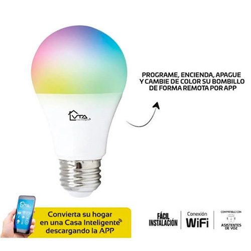La Bombilla LED Inteligente VTA+ E27 RGB 120VAC es una solución versátil para la iluminación de tu hogar inteligente. Con esta bombilla inteligente, puedes ajustar el color y la intensidad de la luz a través de la aplicación VTA+ o por comandos de voz si está integrada con tu asistente de voz preferido. Además de brindarte un control completo sobre la iluminación, esta bombilla te permite programar horarios y crear ambientes personalizados para diferentes momentos del día. Esto no solo te ofrece comodidad, sino que también te ayuda a ahorrar energía al utilizar la luz de manera eficiente. – Activación remota por aplicación – Automatice y controle su iluminación de forma remota – Diseño y tamaño igual a un bombillo normal – Color de luz cálida 2700k – Color de luz Blanco 6500k – Color de luz RGB: rojo, verde, azul y combinaciones – Color e intensidad ajustable desde la App – Bombillo con Socket E27 – Voltaje de 125VAC 60Hz – Potencia 9W – Intensidad lumínica: 800 Lúmenes – Ángulo de iluminación 220° – Frecuencia de transmisión y recepción inalámbrica: 2.4GHz – Compatible con asistente de voz con Google Home y Alexa.