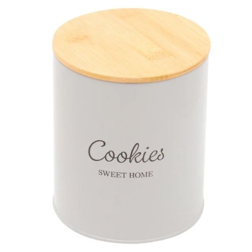 El bote de hojalata para cocina Home Basics con tapa de bambú en color gris Bonny, diseñado para ofrecer estilo y funcionalidad, combina a la perfección la estética clásica con la utilidad moderna. El cuerpo de hojalata cuenta con una elegante inscripción: Cookies – Sweet Home, que añade un toque encantador a su encimera.