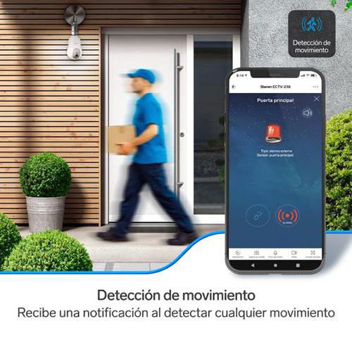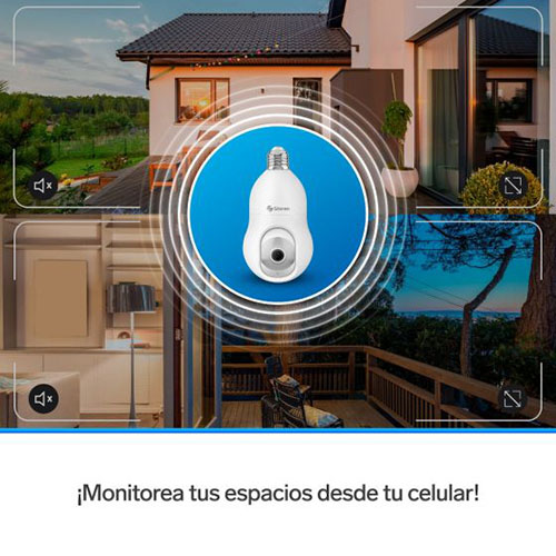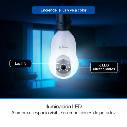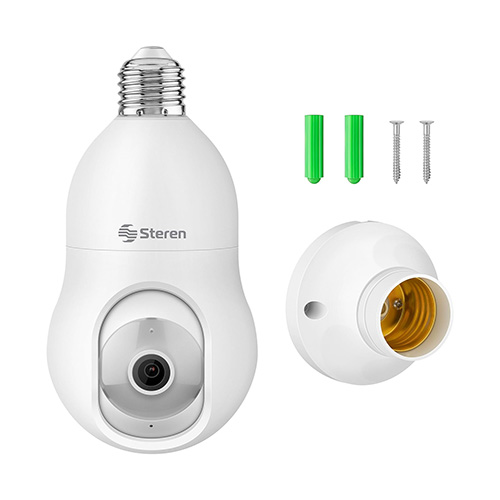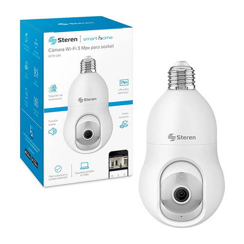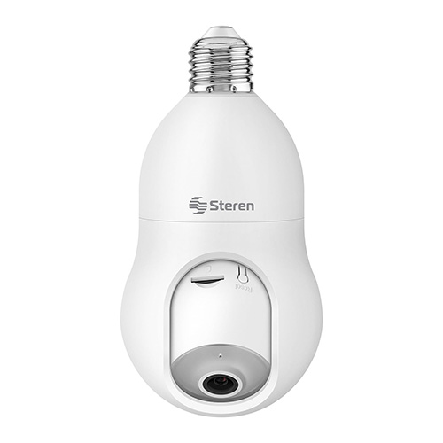 Con esta cámara de seguridad Wi-Fi*, monitorea cualquier lugar a través de tu celular. Vincúlala por Wi-Fi* a tu módem y configúrala con nuestra app Steren Home (disponible en App Store* y Google Play*), para controlar su movimiento y todas sus funciones – Fácil instalación: Gracias a su rosca integrada solo tendrás que conectarla en cualquier socket estándar – Gran resolución: La cámara tiene 3 Mega pixeles de resolución, esto significa un 50% más que Full HD, por lo que podrás visualizar imágenes, como rostros o placas, con excelente nitidez y detalle – Conexión Wi-Fi*: La cámara se vincula por Wi-Fi* a redes de 2,4 GHz, lo que asegura gran alcance inalámbrico – Visualiza también en Web: Visualiza fácilmente la imagen de la cámara desde un explorador de internet con tan solo escanear un Código QR – Luz LED: Incorpora iluminación de luz fría por medio de 6 LED ultrabrillantes, que puedes activar, desactivar o programar desde la app – Movimiento: Controla con tu celular el desplazamiento horizontal o vertical de la cámara, para vigilar todo alrededor – Detección de movimiento: Al activarse esta función, envía una notificación al celular. También puede programarse para que únicamente grabe en cuanto algo o alguien pase enfrente – Seguidor de movimiento: Detecta la presencia de alguien o algo y lo sigue en su recorrido, siempre que esté dentro del ángulo de visión – Detección de sonido: Esta función envía una notificación a tu celular cuando la cámara detecta algún ruido, esto es muy útil en lugares donde no deba haber presencia de alguien – Visión nocturna: Los LED infrarrojos proporcionan a la cámara visión nocturna que te permitirá vigilar y monitorear aun en la oscuridad – Audio bidireccional: Esta cámara de vigilancia incorpora comunicación bidireccional, esto quiere decir que tiene micrófono para que escuches lo que sucede, y bocina para que te oigan en donde está instalada, mientras ves todo en tiempo real – Graba en microSD1: Los videos se guardan en una memoria microSD que puede ser de hasta 128 GB de capacidad – Función de sirena: Desde la aplicación puedes activar una alarma audible.