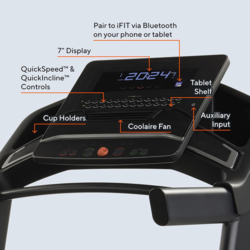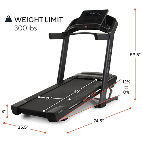 Pantalla de 7” de alto contraste; si no utiliza su propio dispositivo, la pantalla incorporada mostrará lecturas de estadísticas en vivo, incluida la inclinación, la velocidad, la distancia y las calorías estimadas – Amortiguación ProShox; entrene de manera más cómoda con nuestra tecnología de amortiguación patentada – Controles QuickSpeed de 0 a 12 MPH y controles QuickIncline de 0 % a 12 % de inclinación; olvídate de tener que tocar repetidamente un signo más o menos para alcanzar la intensidad que deseas. Solo toca la velocidad que prefieras con un toque para realizar ajustes rápidos – Ruedas de transporte y diseño SpaceSaver; se pliega cuando no está en uso y se enrosca para maximizar el espacio – Ajuste inteligente; con una membresía iFIT (se vende por separado), su máquina puede seguir automáticamente la velocidad, la inclinación y la resistencia de su entrenador iFIT. Con SmartAdjust, esos ajustes automáticos seguirán ocurriendo, pero se personalizarán para adaptarse a su nivel de condición física en función de su historial de entrenamiento y rendimiento – Pulso activo; con una membresía iFIT (se vende por separado) y utilizando su propio monitor de frecuencia cardíaca conectado por Bluetooth, la intensidad de su entrenamiento se ajustará automáticamente para permanecer dentro de su zona de frecuencia cardíaca objetivo.