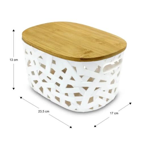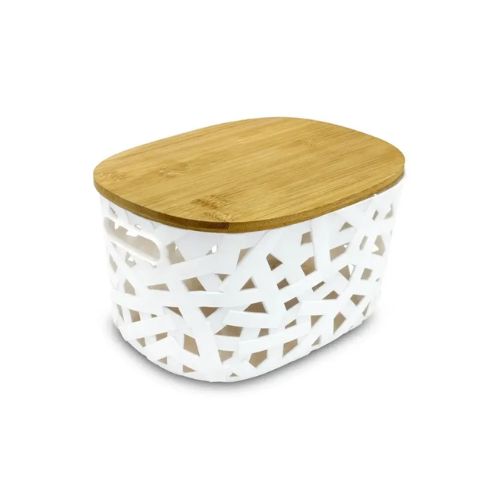 Canasta organizadora multiusos blanca de 13 x 23.5 x 17 cm con estructura plástica semi rígida resistente a caídas y tapa de bambú. Diseño entramado de líneas aleatorias que le otorga un toque destacado, único y juvenil al hogar.