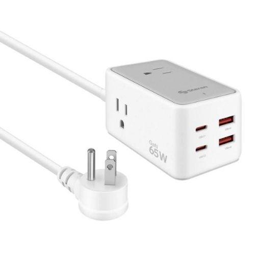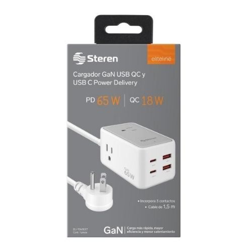 Estación de carga compacta con tecnología GaN que ofrece mayor eficiencia y menor calentamiento. Incluye 3 contactos de CA, un puerto USB-A Quick Charge de 18W y un puerto USB-C Power Delivery de 65W para carga rápida de laptops y smartphones. Cuenta con un cable de 1.5 metros de longitud.