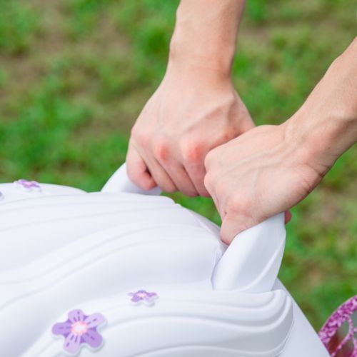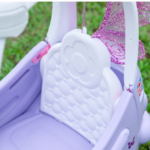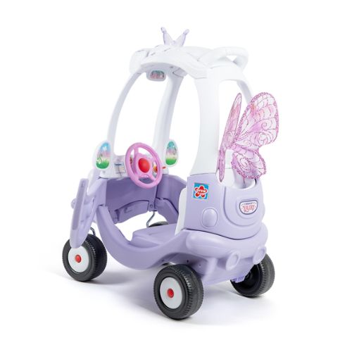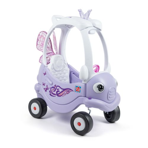 Cupé con temática de hadas y corona brillante. Las ruedas delanteras giran 360 grados para una fácil maniobrabilidad y un control total. Un mango de empuje controlado por un adulto. Un asiento con respaldo alto y un espacio de almacenamiento en la parte trasera. 2 puertas funcionales con pestillos para mayor seguridad. Bocina funcional e interruptor de encendido con clic para simular conducir un automóvil real.
