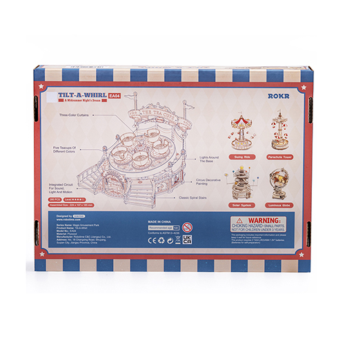 Con la decoración exterior de cortina del Circo Gitano que viajó por Europa en el siglo XVIII, la clásica atracción Tilt-A-Whirl presenta un encanto asombroso – Las tazas giran sobre su propio eje mientras la base gira simultáneamente – Base inclinada 15°: Muestra diseños exquisitos a continuación – Luz cálida y fluida: Añade un toque de elegancia – Motor reductor de corriente continua: Accionar el conjunto de engranajes para girar – Cortina estilo bohemia: Diseño retro con 3 colores clásicos – Impresionante base lateral: 9 exquisitos grabados con estilos de dibujos animados.