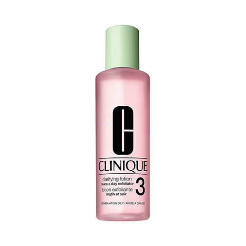 Clarifying Lotion 3 – Piel mixta grasa. ¿Qué es? Es el Paso 2 en nuestro Sistema de 3 Pasos personalizado para el cuidado de la piel. Loción exfoliante líquida desarrollada por dermatólogos despeja el camino para una piel más uniforme y saludable. ¿Qué hace? La fórmula suave y refrescante marca la diferencia para una piel sana. Elimina la contaminación, suciedad, piel muerta dejando una piel más lisa y clara.Deja fresca tu piel gracias a la fórmula que incluye Hamamelis, un purificante que deja la piel limpia y refrescada.Prepara la piel para el hidratante – exfoliar la piel hace que la piel sea más receptiva a los hidratantes y tratamientos.Para pieles más grasas, la exfoliación dos veces al día ayuda a minimizar el exceso de grasa en la piel y deja los poros limpios.Para pieles más secas, la exfoliación dos veces al día ayuda a remover la piel muerta que pueden obstruir la absorción de la humedad. Incluso, ayuda a disminuir las finas líneas. El secreto del sistema. Nuestro revolucionario Sistema de 3 Pasos fue creado por un reconocido dermatólogo. Es simple, personalizado y toma tres minutos, dos veces al día: limpia con Facial Soap, exfolia con Clarifying Lotion, humecta con Dramatically Different Moisturizing Lotion+, Gel libre de aceite o Jelly ligero. Hay una rutina del cuidado de la piel Clinique perfecta para ti. Encuéntrala ahora. Nuestra filosofía de pureza: Sin parabenos. Sin ftalatos. Sin fragancia. Piel simplemente feliz.