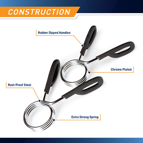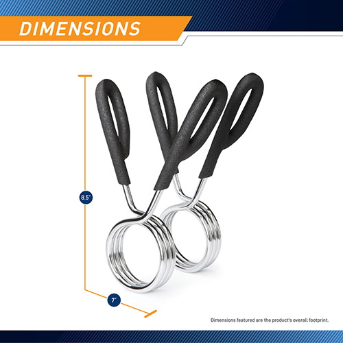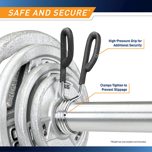 Además de agregar eficiencia y facilidad a su rutina de entrenamiento de fuerza en el gimnasio en casa, estos resistentes collares con clip de resorte de acero también ofrecen un agarre seguro para cualquier barra de 2 pulgadas que sostenga pesas olímpicas para evitar accidentes peligrosos e inevitables con el equipo de levantamiento de pesas. Los collares con clip de resorte para barra olímpica Marcy se venden en pares y son una excelente incorporación a cualquier colección de equipos de entrenamiento para gimnasios en casa.