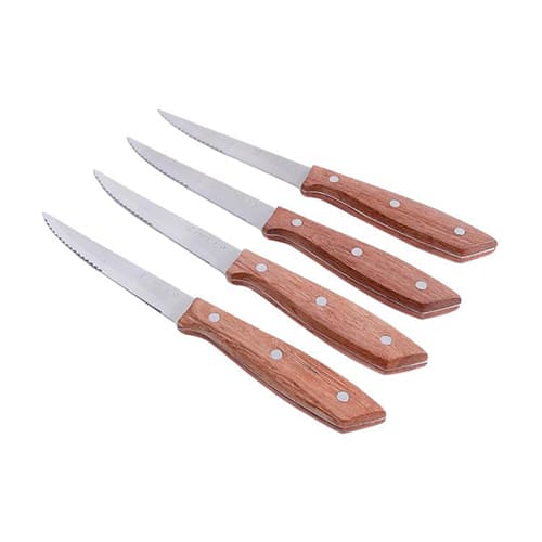 Cuchillos para bistec de 4.25 pulgadas. Acero inoxidable con mangos de madera. Apto para lavavajillas.