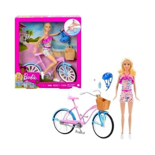 Diseñada con bonitos tonos rosas y azules con detalles plateados y una cesta, la bicicleta inspira todo tipo de historias. Los pedales y las ruedas hacen que montar en bicicleta sea muy fácil: coloca a la muñeca Barbie en el asiento, pon sus manos en el manillar y luego empuja. La muñeca Barbie se dobla a la altura de las caderas, las rodillas y los brazos para jugar de manera fácil y en diferentes posturas. Con un precioso mono con volantes y un estampado de corazones arcoíris, está lista para cualquier aventura. Los accesorios incluyen un casco y una botella de agua que cabe en la cesta de la bicicleta, para que te lleves la diversión a cualquier lugar. ¡Las niñas de 3 a 7 años pueden llevarse este conjunto para dar un paseo corto o pedalear hacia la aventura! La muñeca no puede tenerse en pie ni montar por sí sola. Los colores y la decoración pueden variar.
