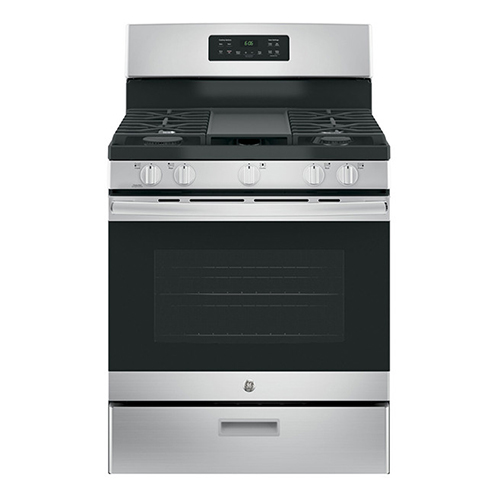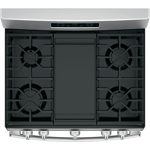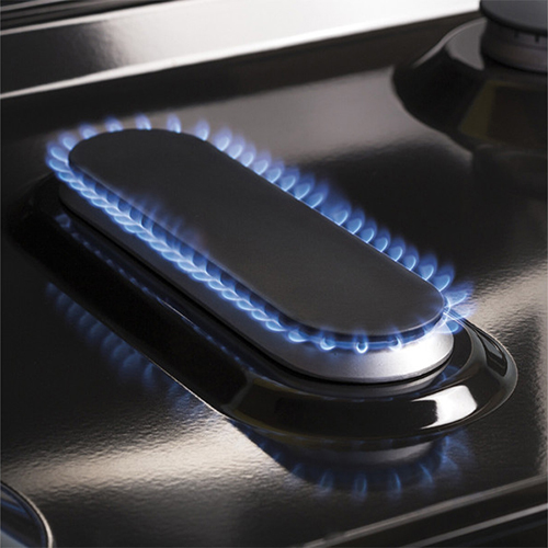 Estufa de borde a borde; una gran superficie de cocción le brinda espacio adicional para ollas y sartenes de todos los tamaños y permite que los utensilios de cocina se muevan fácilmente de un quemador a otro. Plancha antiadherente integrada extragrande; cocine hasta seis quesos a la parrilla a la vez en la plancha integrada más grande de la industria. Quemador central ovalado; el quinto quemador ovalado grande es ideal para cocinar a la plancha. Quemador de ebullición de potencia de 15.000 BTU; proporciona altas temperaturas para hervir rápidamente. Rejillas resistentes para lavavajillas; limpiar rejillas de forma fácil y segura en el lavavajillas. Quemador a fuego lento preciso; los alimentos delicados no se queman a fuego lento y uniforme. Limpia a vapor; ahorre tiempo y esfuerzo limpiando el horno con vapor después de cocinar. No se requiere agua especial, kits o pasos adicionales. 5.0 pies cúbicos pies de capacidad del horno. Quemadores de placa de cocción sellados, contiene derrames, facilita y agiliza la limpieza. Reloj y temporizador electrónicos.