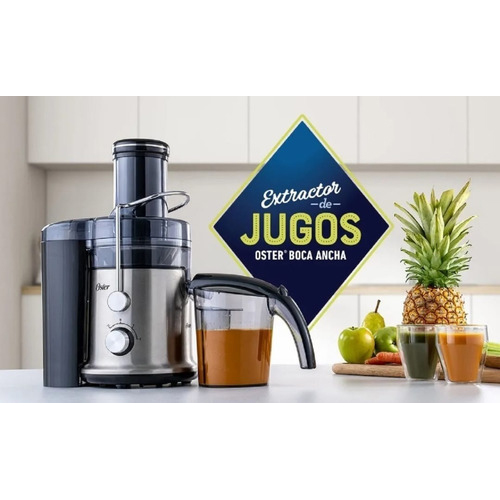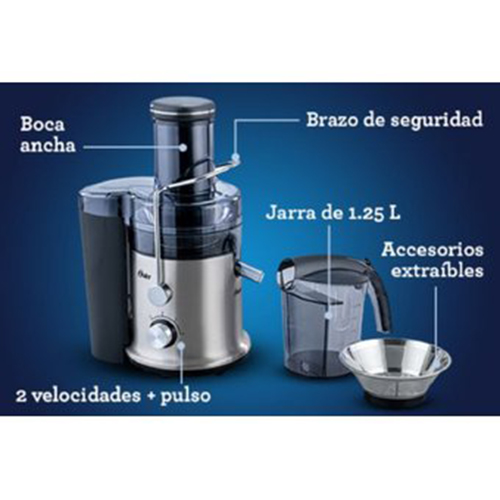 El extractor de jugos Oster® extrae lo mejor de la innovación. Cuenta con prácticamente todos los beneficios que te gustaría tener en un solo extractor, e inclusive más. Su boca de alimentación es dos veces más grande, cuenta con accesorios removibles y sus dos velocidades + pulso permiten extraer el jugo tanto de ingredientes blandos como duros. Y ahí no queda todo, porque un estilo de vida saludable es tan importante como lo que tienes a tu alcance. 2 velocidades + pulso para extraer el jugo de ingredientes duros y blandos. Fácil de limpiar porque sus accesorios son extraíbles. Jarra con capacidad para 1,25 L, con separador de espuma. Brazo de seguridad de acero inoxidable, que garantiza que el extractor de jugos solo funcione cuando está cerrado.