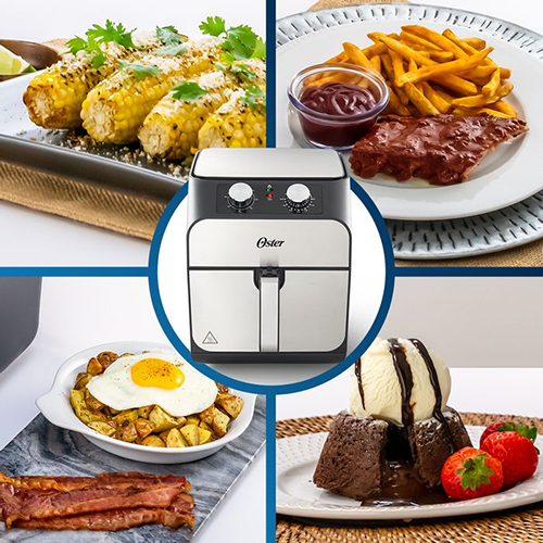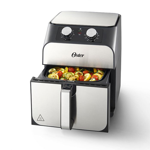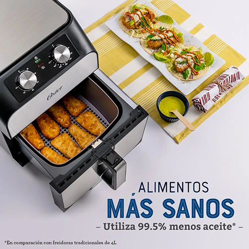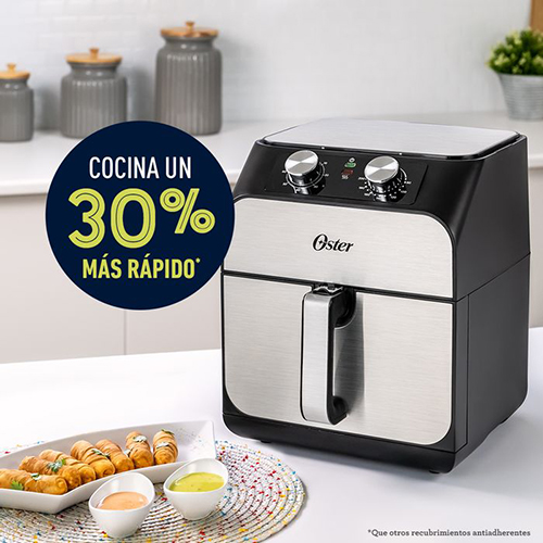Freidora de aire con 5.5 litros de capacidad, donde puedes preparar hasta un pollo pequeño entero, vegetales, frituras y mucho más. Su recubrimiento de Bioceramic™, además de ser duradero, es natural y no contiene tóxicos. Cocina hasta un 30% más rápido que otros recubrimientos antiadherentes, para ahorrar energía y tiempo. Recubrimiento Bioceramic® 100% natural, libre de PTFE y PFOA, 4 veces más duradero y resistente a rayaduras. Control de temperatura variables. Temporizador de 60 minutos con alerta sonora de “Listo”.