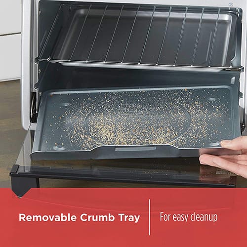 El horno de seis rebanadas de pan Black & Decker tiene tecnología de convección que circula aire caliente para cocinar pizzas y congelados favoritos por mínimo tiempo. El interior está diseñado para el enfoque hacia la comida rápida e incluso cocinar. Las funciones de cocción son hornear, asar, tostar y mantener caliente. Tiene una capacidad para una pizza de 9″. Cuenta con una potencia de 1350 watts. Incluye: selector de temperatura, selector Multi-Función, cronometro a 30 minutos, puerta de vidrio con asa fría al tacto, luz indicadora de funcionamiento, bandeja para hornear y bandeja para azar.