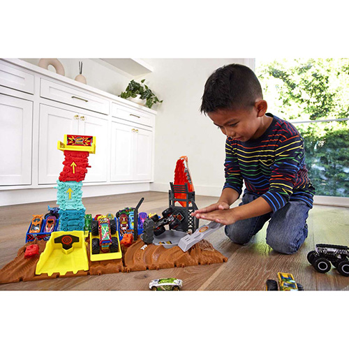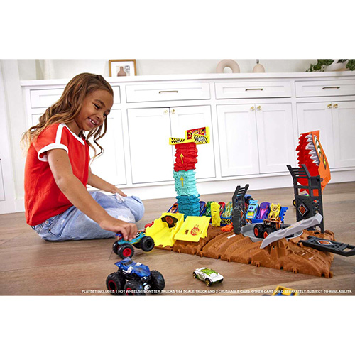 Niños y niñas sienten el poder de los choques y aplastamientos en la palma de su mano con el conjunto de juego de semifinales Hot Wheels Monster Trucks Arena Smashers. La base de cada conjunto se mueve y se agita, creando una respuesta sensorial mientras los camiones impactan contra las zonas de choque y niños y niñas exploran el paisaje. Cada conjunto incluye un Monster Truck de Hot Wheels y dos coches aplastables, y se puede conectar a otros conjuntos para crear un épico estadio de Monster Trucks. Se venden por separado y están sujetos a disponibilidad. Los colores y la decoración pueden variar.