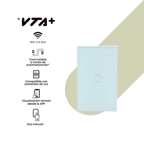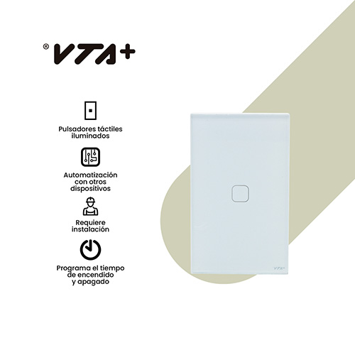 Introduciendo el Interruptor Táctil Sencillo VTA Connect IOT, una solución inteligente y versátil para el control de la iluminación en tu hogar. Este interruptor táctil te permite controlar de forma manual o remota tus bombillos o sistemas de iluminación con un diseño elegante y compacto que se empotra fácilmente en la pared – Con esta innovadora tecnología, puedes activar tus luces desde la aplicación VTA+ en menos de 2 segundos, lo que te brinda un control instantáneo y conveniente sobre la iluminación de tu hogar. Además, puedes programar el tiempo de encendido o apagado para ahorrar energía o crear ambientes personalizados – Compatible para control con asistentes de voz – Voltaje de operación: 125 VAC 60Hz – Corriente: 10 A – Potencia: 800W – Eficiencia =90% – Frecuencia de transmisión y recepción inalámbrica: 2.4GHz.