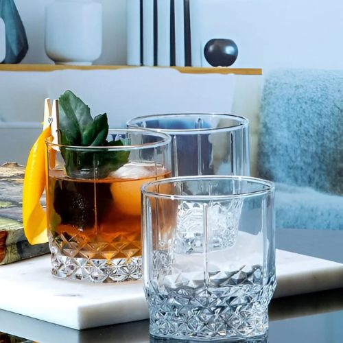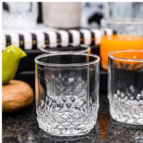 Juego de vasos modelo Valse de 6 piezas en resistente vidrio transparente y detalles en la parte inferior en alto relieve.