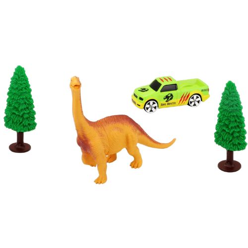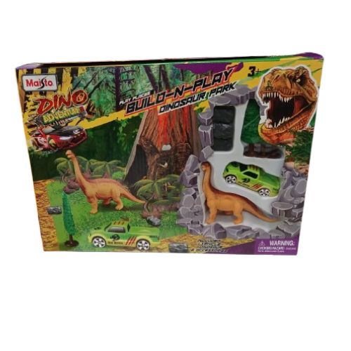 El conjunto incluye un entorno de cartón detallado que se pliega y encaja para formar un volcán, un telón de fondo prehistórico y un terreno verde. También en la caja hay una selección de accesorios de plástico que incluyen un dinosaurio, árboles y rocas, así como un auto Fresh Metal fundido a presión de 3 pulgadas