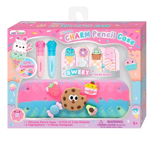 Este juego incluye: 1 estuche de silicona para lapices, 5 dijes decorativos, 2 resaltadores, 4 blocs de notas adhesivos. Colores y accesorios sujetos a disponibilidad.*