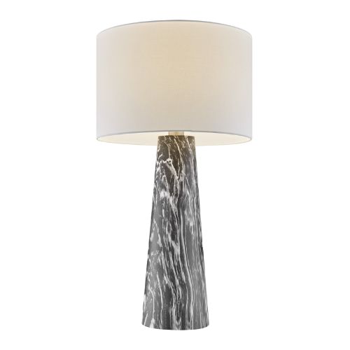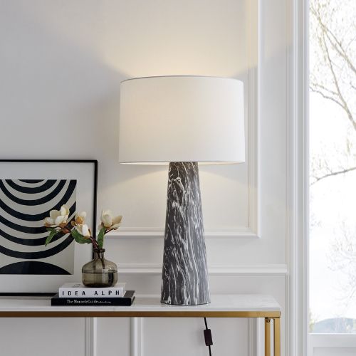Base de metal con acabado en m谩rmol gris y blanco. Pantalla de tela blanca Interruptor de encendido/apagado en el cable Admite una bombilla tipo A de 100W, no incluida.