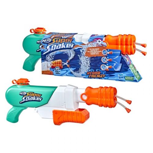 El Super Soaker Hydro Frenzy de Nerf está diseñado con 2 tubos en el cañón y una boquilla ajustable para cambiar la forma en que sale el agua de los tubos, ¡para una diversión 3 en 1! Desata 2 chorros paralelos desde el lanzador, tira de la boquilla hasta la mitad para rociar 2 chorros amplios, o tira de la boquilla hasta el final para una acción alocada, ya que los tubos giran alocadamente en todas las direcciones, enviando chorros de agua por todas partes. Cualquiera que se encuentre en el radio de acción puede quedar empapado, ya que los tubos giran y vuelan. Fácil de usar: Llena el tanque y bombea la manivela para empezar a empapar. Tiene capacidad para 0.7 L.