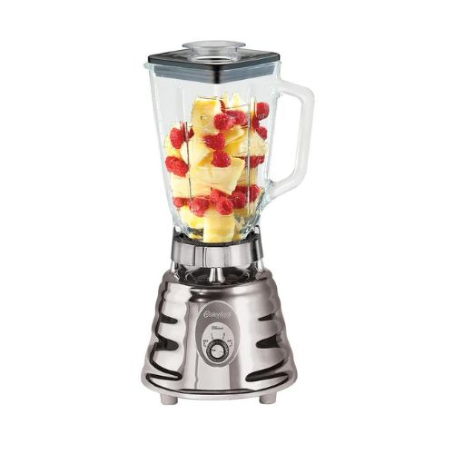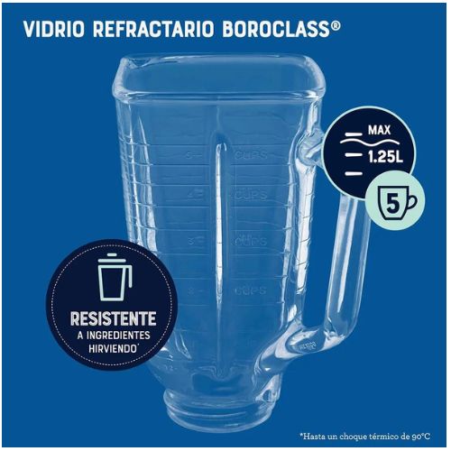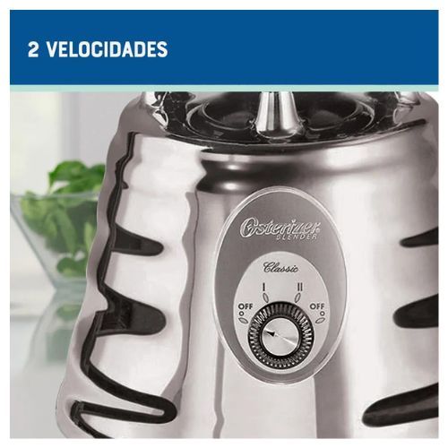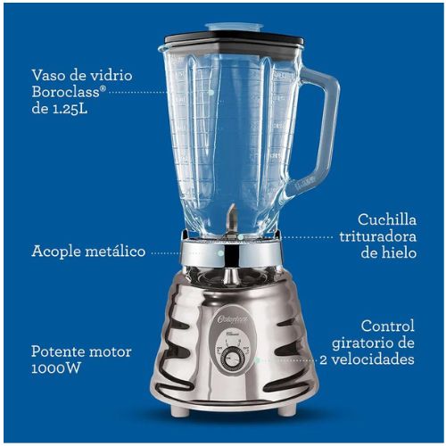 Las icónicas licuadoras Oster® son sinónimo de eficiencia y durabilidad. Nuestra licuadora clásica Oster® en cromo con control giratorio de 2 velocidades te brinda una experiencia inigualable. Su potente motor con 1000 W de potencia***, vaso de vidrio refractario Boroclass® resistente a ingredientes hirviendo*, acople metálico 10 veces más fuerte**, junto con su revolucionaria cuchilla trituradora de hielo te ayudan a preparar deliciosas y saludables recetas. Vaso de vidrio refractario Boroclass® de 1,25 litros (5 tazas) de capacidad resistente a ingredientes hirviendo* que es perfecto para preparar sopas y otros platos calientes o fríos. Potente motor con 1000 W de potencia***. Sistema de acople de metálico 10 veces más fuerte** entre la cuchilla y el eje de la base que prolonga la vida de la licuadora. Control giratorio de 2 velocidades. Revolucionaria cuchilla de acero inoxidable trituradora de hielo. Hasta un choque térmico de 90° **Resistencia a la tracción de acero laminado en frio 1213 comparado con plástico PP ***Potencia pico