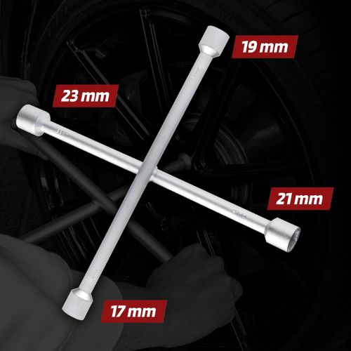 Fabricada con materiales de alta calidad, esta llave de cruz ofrece una durabilidad y resistencia excepcionales, permitiéndote aplicar la fuerza necesaria para aflojar o apretar tuercas sin preocuparte por la deformación o rotura de la herramienta. La forma de cruz proporciona un apalancamiento óptimo y una distribución uniforme de la fuerza, facilitando el uso y reduciendo el esfuerzo necesario para cambiar las ruedas. Fácil de almacenar en el maletero. Herramienta de alta calidad. Fácil de usar.