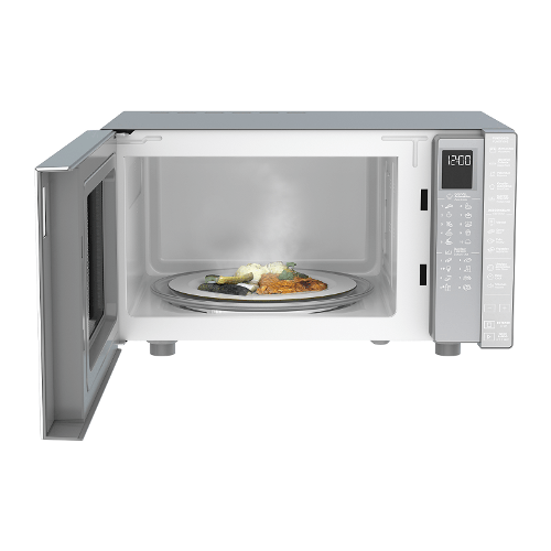 Microondas 1.1 p³ color Silver con Acabado Espejo con 25 funciones preprogramadas + funciones especializadas (mantener caliente y limpieza automática) control Electrónico touch, 7 niveles de potencia, Suavizar/Derretir. Cuenta con opciones de: Cocción automática, inicio rápido +30 segundos, reloj, display LCD, iluminación incandescente interior y plato giratorio. Además de su función de Limpieza Automática, cuenta con función de Mantener Caliente, Descongelar Manual Pizza, Bebidas, Arroz, Pescado, Descongelar Carne, Descongelar Pollo y Palomitas, Recubrimiento protector de polvo.