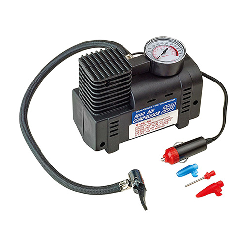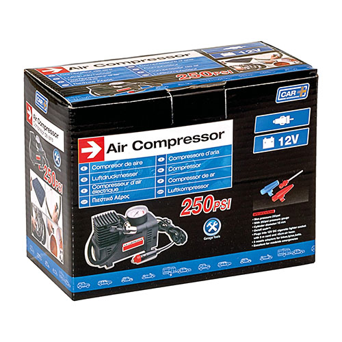 Compresor de aire Grupo Sumex clásico que es de color negro y fácil de usar. Viene con un conector para el encendedor de cigarrillos para enchufarlo en el carro. Las medidas indican que la presión llega hasta 18 bares y funciona con 12V.