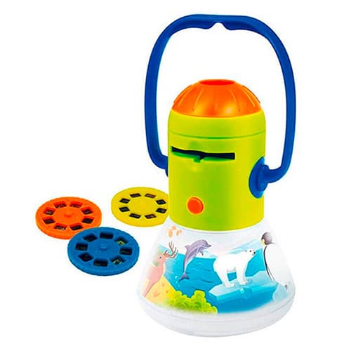 Iluminación tipo LED con temporizador de apagado tras 15 minutos. Incluye 3 discos con 8 diapositivas cada uno. Funciona con 3 pilas tipo botón AG13 (LR44), incluidas.
