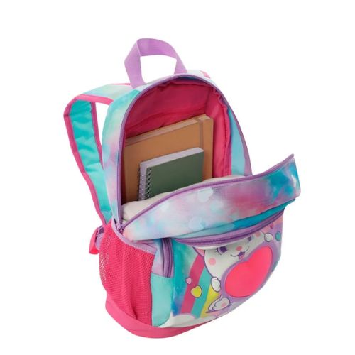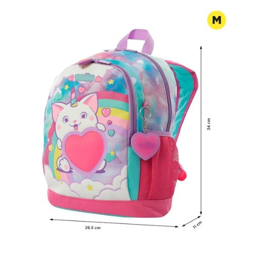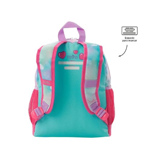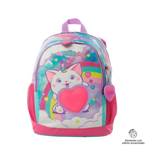 Confeccionada en poliéster, presenta un hermoso estampado con glitter. Cuenta con un compartimiento principal con doble cremallera, correas acolchadas ajustables, manija superior y bolsillos laterales porta botellas. Además, su bolsillo frontal con cierre sirve para guardar objetos pequeños. Cuenta con un llavero interactivo en forma de corazón.