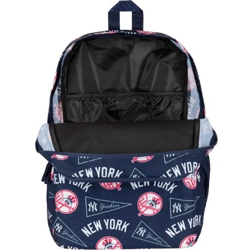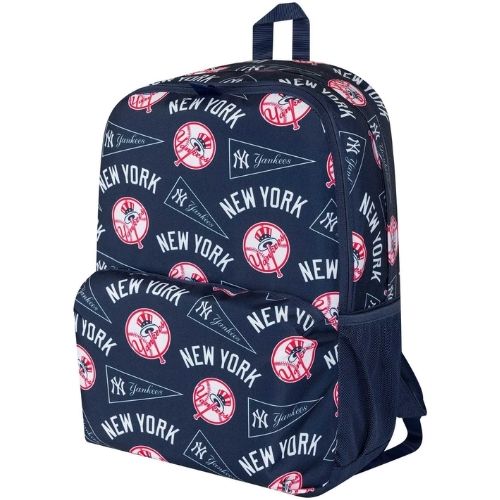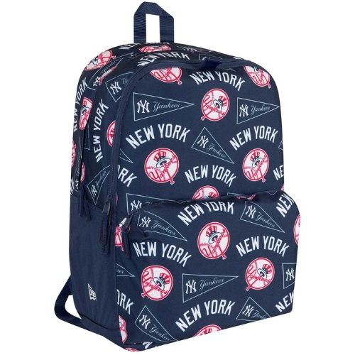 Mochila oficial MLB New Era NY Yankees en azul marino con gráficos de Los Angeles Dodgers, ideal para escuela, trabajo o uso casual. Cuenta con compartimento para portátil, dos compartimentos con cremallera, bolsillo frontal y lateral de malla, panel trasero y correas acolchadas, asa superior y lazo frontal para sujetar accesorios. Su diseño cómodo y funcional combina estilo deportivo con practicidad diaria.