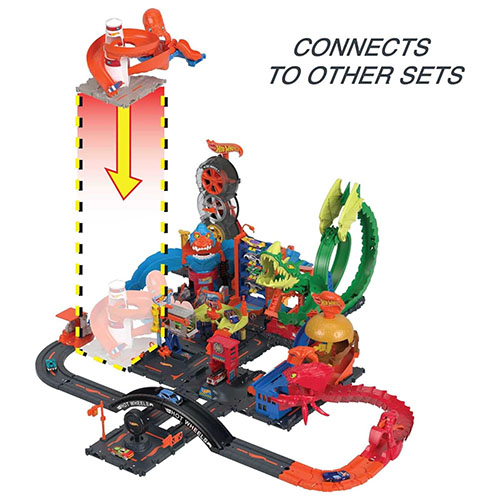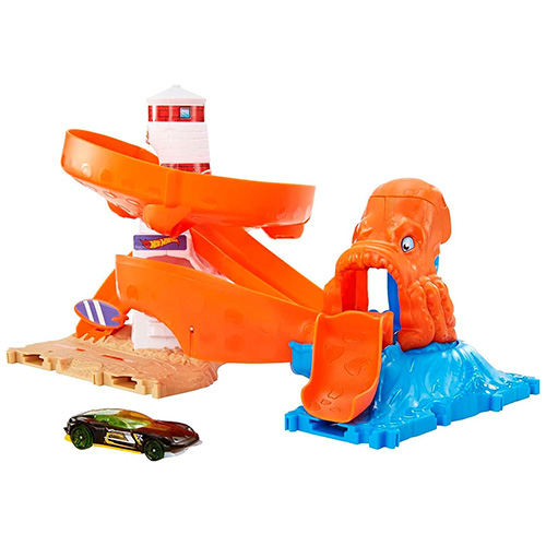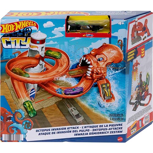 Oakie el pulpo ha enredado sus tentáculos en el faro de Hot Wheels™ City ¡y esto crea oportunidades geniales para jugar en pistas de varias direcciones y emocionantes combinaciones! Lanza los vehículos desde la cabeza de Oakie hacia una de las cuatro pistas que rodean y suben por el faro. Abre y cierra la puerta de tabla de surf para controlar si los autos pasan rápidamente a nuevas aventuras o si se quedan al alcance de los tentáculos. Viene con 1 vehículo Hot Wheels® para comenzar a desafiar a la bestia de inmediato. Con múltiples puntos de conexión, los niños pueden conectar este set de juego con otros sets Hot Wheels® y crear un paisaje urbano lleno de criaturas, con tantas increíbles posibilidades narrativas que querrán coleccionarlos todos (cada uno se vende por separado). A los niños de 4 a 8 años les encantará el set de juego Hot Wheels™ City Octopus Invasion Attack. Es un gran regalo que fomenta la exploración y creatividad independientes.