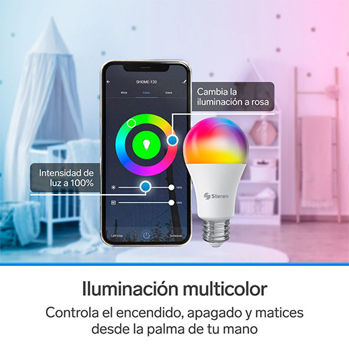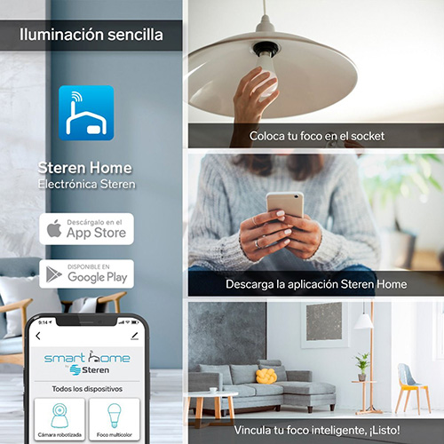 ¡Convierte tu casa en una Smart Home y ambienta sus espacios con iluminación multicolor! Luz multicolor: Estos focos inteligentes incorporan LED RGB, para iluminar con miles de matices y adaptarse perfectamente a cualquier tipo de situación. Luz fría: Tienen LED de luz fría independientes, ideales para espacios dinámicos o de trabajo. Luz cálida: También cuentan con LED de luz cálida independientes, ideales para espacios de relajación y confort. Conexión Wi-Fi: Se vinculan por Wi-Fi en redes de 2,4 GHz, lo que asegura gran alcance inalámbrico. Compatibilidad: Se colocan en cualquier socket estándar (E27), por lo que no será necesario hacer modificaciones en tu instalación; solo cámbialos. App Steren Home: Su uso se administra por medio de nuestra app Steren Home, desde donde puedes cambiar el color de la iluminación, controlar el encendido y apagado instantáneo o por programación de horarios y rutinas, compartir el control con otros usuarios y mucho más. Control por voz: Estos focos inteligentes son compatibles con los asistentes Alexa* y Google Assistant* que te dan comodidad de uso dentro de tu hogar, al activar o desactivar los focos con tu voz. Bajo consumo: Cada uno consume solamente 10 W.