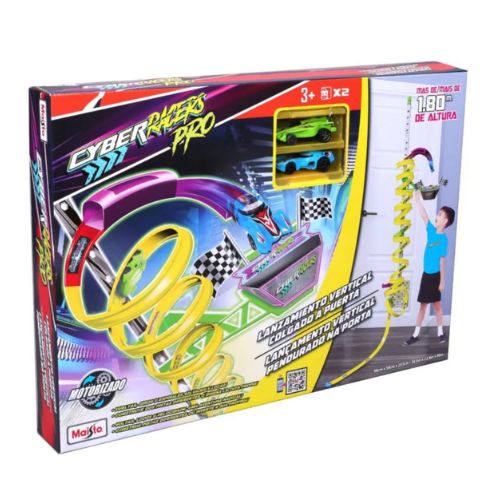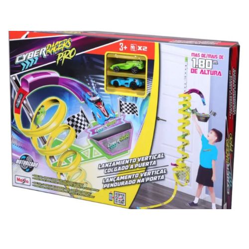 La pista Door Hoop cuelga de una puerta con múltiples bucles para subir hasta la cima. La pista también se puede colocar en el suelo en diferentes configuraciones Incluye dos vehículos Cyber Racer con mecanismo de retroceso, una pista de 10 bucles, conectores, un colgador de puerta y una sección de retorno con una meta.