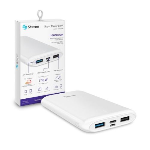 Carga al 100% tu celular hasta 4 veces o tu tablet al 100%. Alta capacidad: 10,000 mAh. Carga 2 dispositivos al mismo tiempo. Salida USB C PD: Entrega hasta 18 W. Salida USB Turbo Charge: Entrega hasta 3 A Salida USB estándar: Entrega hasta 2,1 A Incluye cable para Android (USB a micro USB)