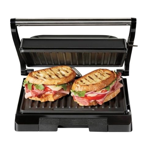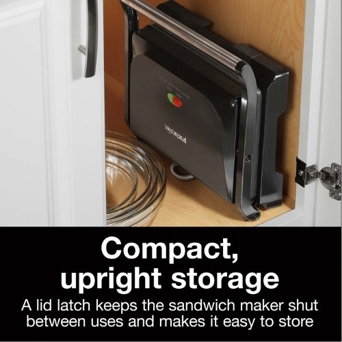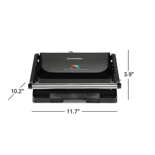 Prensa y parrilla para panini 2 en 1 Fácil de limpiar con placas antiadherentes duraderas. Tuesta 2 sándwiches gruesos a la vez Almacenamiento compacto y vertical Mantenga las encimeras más limpias con una bandeja de goteo deslizable apta para lavavajillas Fácil de usar: las luces de encendido y precalentamiento eliminan las dudas
