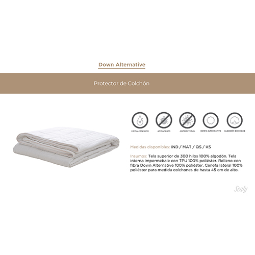 Los protectores de colchón down alternative son repelentes al agua y ofrecen beneficios que puede mejorar la comodidad y protección de tu colchón, como hipoalergénico, comodidad adicional, reducción de ruido, ajuste seguro, facilidad de limpieza y la prolongación de la vida útil de tu colchón – Cubre colchón suave y acolchado que no altera la sensación de tu colchon; tiene un ajuste perfecto gracias a su tela elástica que se ajusta a colchones de hasta 45 cm de altura -Composición: tela superior de 300 hilos 100% algodón. Tela impermeable con PTU. Relleno de fibra Down Alternative – Cuidados: usar detergente liquido suave. No usar cloro, ni suavizantes. Secar colgado o con secadora a temperatura media. No lavar en seco. No planchar. Dar un ligero masaje para volver a esponjar las fibras – Datos técnicos: Tela superior de 300 hilos 100% algodón. Tela interna impermeable con TPU 100% poliéster. Relleno con fibra Down Alternative 100% poliéster. Cenefa lateral 100% poliéster para medida colchones de hasta 45 cm de alto.