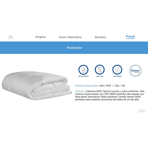 Nuestro protector fresh con fibra de tencel es altamente transpirable y tiene la capacidad de absorber y liberar la humedad de manera eficiente. Esto ayuda a mantener tu colchón fresco y seco durante la noche – Cubre colchón fresh suave y acolchado que no altera la sensación de tu colchon; tiene un ajuste perfecto gracias a su tela elástica que se ajusta a colchones de hasta 45 cm de altura – Composición: tela interna impermeable con TPU 100 % poliéster. Bondeada con fibra down alternative 100 % poliéster – Cuidados: usar detergente liquido suave. No usar cloro, ni suavizantes. Secar colgado o con secadora a temperatura media. No lavar en seco. No planchar. Dar un ligero masaje para volver a esponjar las fibras – Datos técnicos: Cubierta 100% Tencel Lyocell y nylon enfriante. Tela interna impermeable con TPU 100% poliéster. Bondeada con fibra down alternative 100% poliéster. Cenefa laterl 100% poliéster para medida colchones de hasta 45 cm de alto.