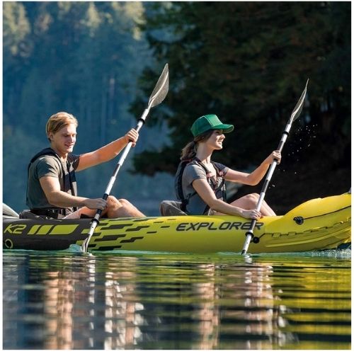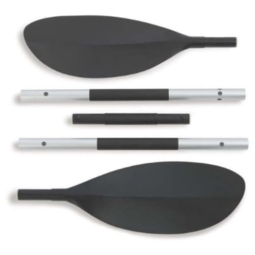 Palas desmontables para llevar en kayak hinchable Intexo en otras embarcaciones como remo auxiliar Las palas son de hoja simétrica y ángulo bajo, el largo total es de 218 cm Pértiga de aluminio resistente y ligero que se pliega dando lugar a 5 partes Fácil de transportar y de almacenar, el ángulo de las palas se puede regular en 3 posiciones Los accesorios para barcas y kayaks Intex cuentan con la certificación alemana de calidad TUV RL
