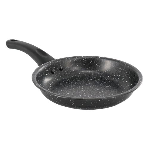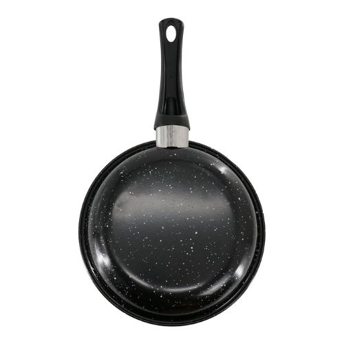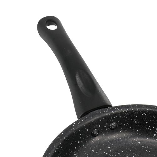 Construcción duradera de acero al carbono. Revestimiento interior antiadherente. Mango de baquelita con agujero para colgar. Doble remachado. Lavar a mano solamente.