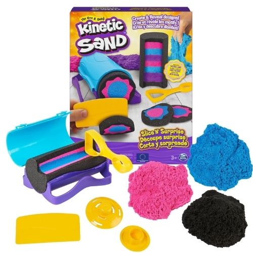 Crea y revela diseños sorpresa: ¡hay tantas formas de jugar con el set Slice N’ Surprise! Llena el cilindro y deslízalo, coloca arena, aplástalo, talla, córtalo y mucho más. ¡Revelar tus sorpresas es muy divertido! 3 colores de arena cinética: este kit Kinetic Sand cuenta con 4.5 onzas cada uno de arena cinética negra, rosa y azul. Esponja la arena y deja que fluya, luego coloque capas, corte y corte con las herramientas para revelar tus diseños únicos