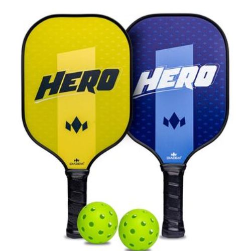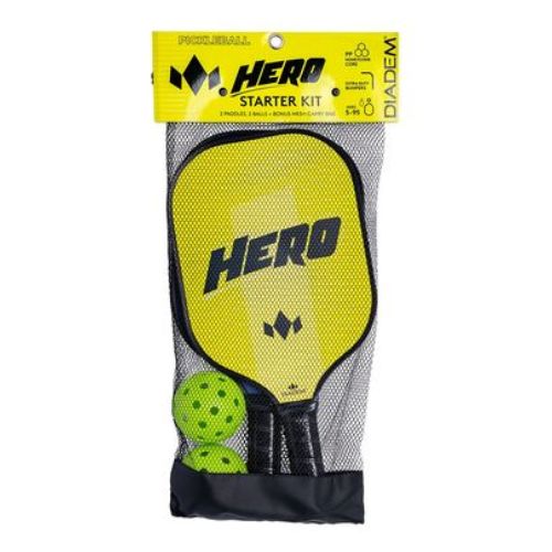 El Kit de Inicio Diadem Hero V2 es el paquete perfecto para quienes se inician en el pickleball. Incluye todo lo necesario, excepto la cancha: dos rauqetas Hero v2 (una amarilla y otra azul), dos pelotas de pickleball y una bolsa de malla. Su cara ancha te ofrece la máxima superficie de contacto con la pelota durante tu aprendizaje. La Hero es ligera y fácil de usar. Su parachoques más grueso evita daños durante tus días de aprendizaje en la cancha. Con un grosor de 0,55 pulgadas y un núcleo de panal de 8 mm, la potencia será fácil de conseguir..