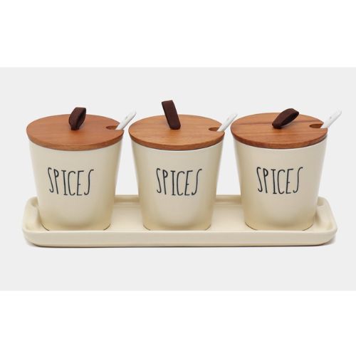 El set consta de tres tarros de especias con tapa y un soporte, perfecto para la cocina, el hogar, la casa de verano o el jardín, así como para mesas diarias y festivas.